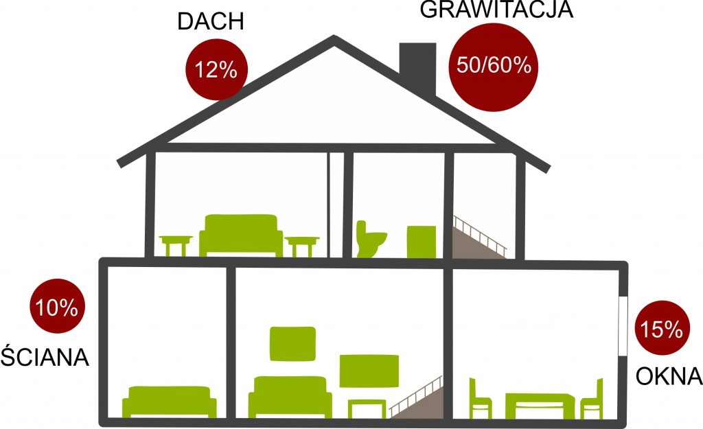 W jednym i drugim przypadku zimne powietrze z zewnątrz (zimą np. -15 stopni C) wpuszczamy do naszego superoszczędnego domu. W efekcie otrzymujemy ogromne straty ciepła budynku na poziomie nawet 60%.
